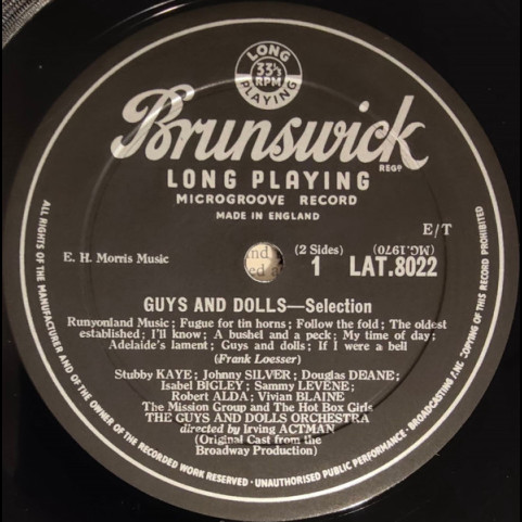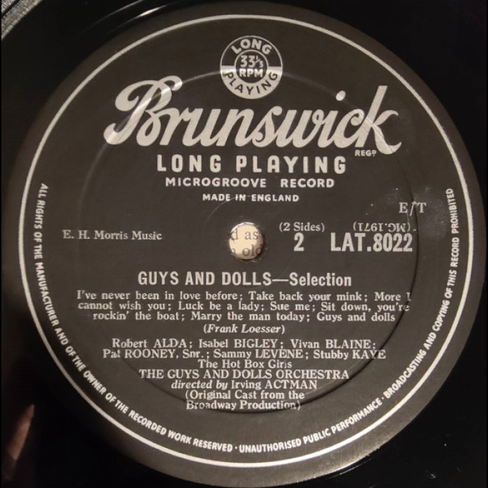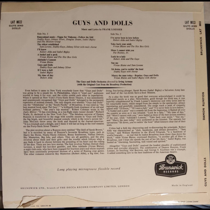 Etichete: "Guys, &, Dolls", Original, Broadway, Cast, , Robert, Alda, , Vivian, Blaine, , Sam, Levene, Guys, &, Dolls:, A, Musical, Fable, Of, Broadway, Vinyl, LP, Album, Brunswick, Stage & Screen, Score, Musical